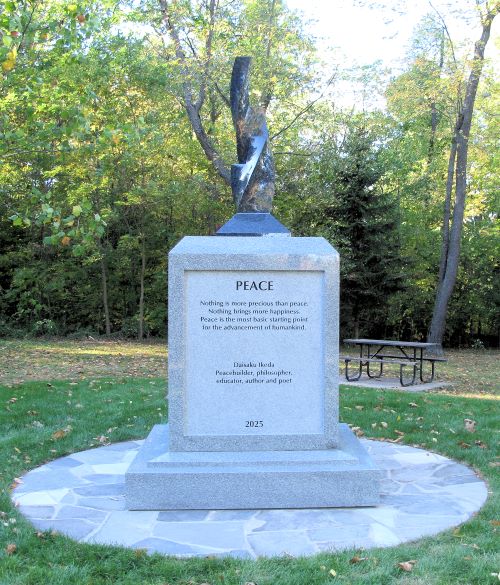 The monument is inscribed with the opening lines of The New Human Revolution, Volume 1. The inscription is engraved in English, French, Kanyen’kéha (or Mohawk) and Anishinaabemowin (or Ojibwe). In English, it reads: